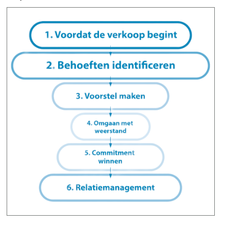 De genoemde stappen zijn op basis van belangrijkheid en toegevoegde waarde voor het proces van een grootte voorzien. Met andere woorden behoefte identificeren wordt als de basis en de meest belangrijke gezien. En natuurlijk weten wat de klant echt wenst, waar deze op aan gaat en vooral wat er spannend is, daar draait het om.