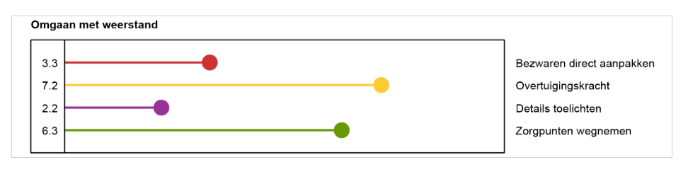 Per stap wordt er een zogenoemde lollipop grafiek gemaakt waarin op basis van een ideaalbeeld een wegen van het eigen profiel gemaakt wordt.